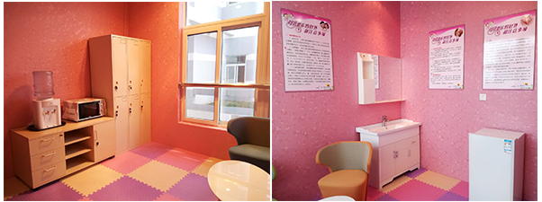“愛心母嬰室”設(shè)置在活動室二樓,面積11平方米,可容納4人同時哺乳。母嬰室內(nèi)設(shè)施完善,配備冰箱,飲水機,儲物柜,微波爐,洗手池,宣傳標(biāo)識牌,軟座沙發(fā)等現(xiàn)代化設(shè)施,可以為哺乳媽媽們提供一個干凈衛(wèi)生、溫馨舒適、安全私密的哺乳環(huán)境。
