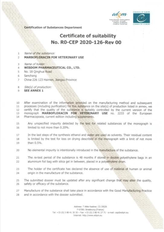 2021年9月21日,江蘇慧聚藥業(yè)有限公司通過EDQM的技術(shù)審批,獲馬波沙星CEP證書。